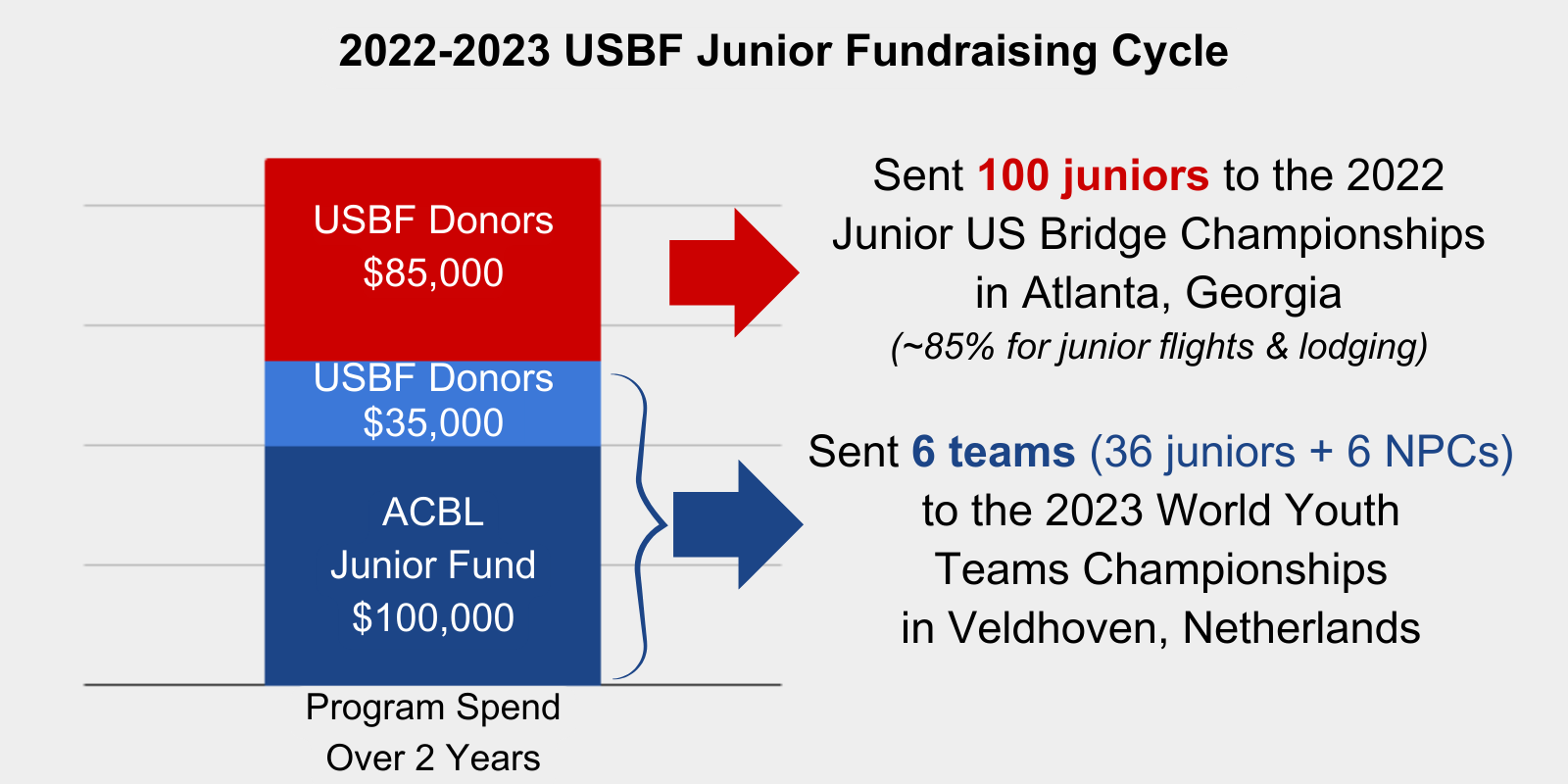 We fundraise for juniors on a two-year cycle that aligns with the bi-annual World Youth Bridge Teams Championships (WYBTC) and Junior US Bridge Championships (JUSBC).
